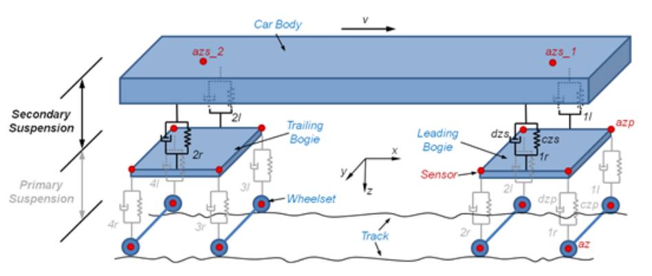 图为悬挂系统模型,分为一级减震和二级减震,由 22 个部件组成(弹簧/阻尼),共安装 18 个振动传感器(红色标识)