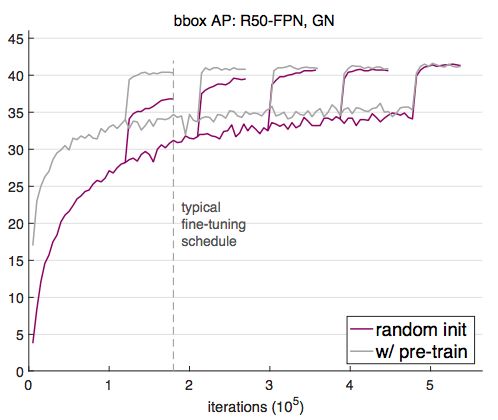 何恺明等人研究表明,在COCO数据集上进行随机初始化训练,其效果能做到不次于在ImageNet上进行预训练。