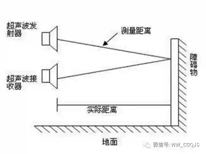 超声波测距的原理比红外线更加简单,因为声波遇到障碍物会反射,而声波的速度已知,所以只需要知道发射到接收的时间差,就能轻松计算出测量距离,再结合发射器和接收器的距离,就能算出障碍物的实际距离,如下图所示。