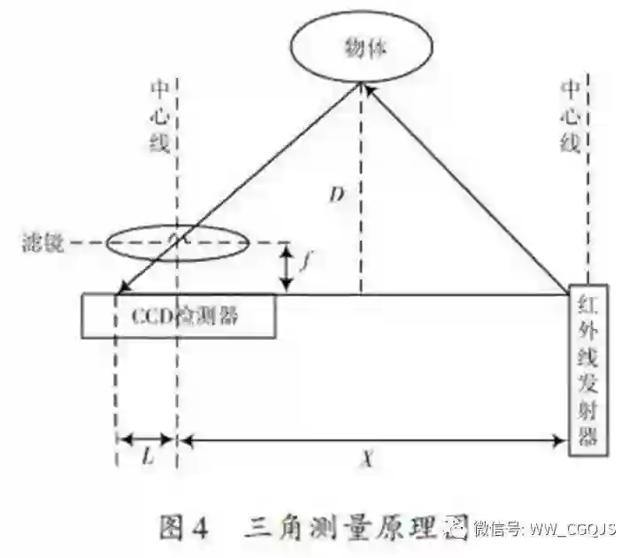 红外感应器包含红外发射器与CCD检测器,红外线发射器会发射红外线,红外线在物体上会发生反射,反射的光线被CCD检测器接收之后,由于物体的距离D不同,反射角度也会不同,不同的反射角度会产生不同的偏移值L,知道了这些数据再经过计算,就能得出物体的距离了,如下图所示。