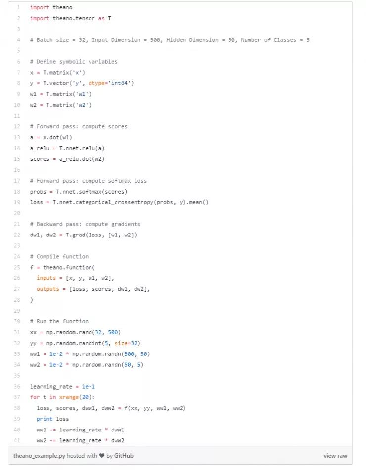 Theano在许多方面与TensorFlow相似。那么让我们来看看另一个代码示例,使用相同批量和输入/输出尺寸来训练神经网络: