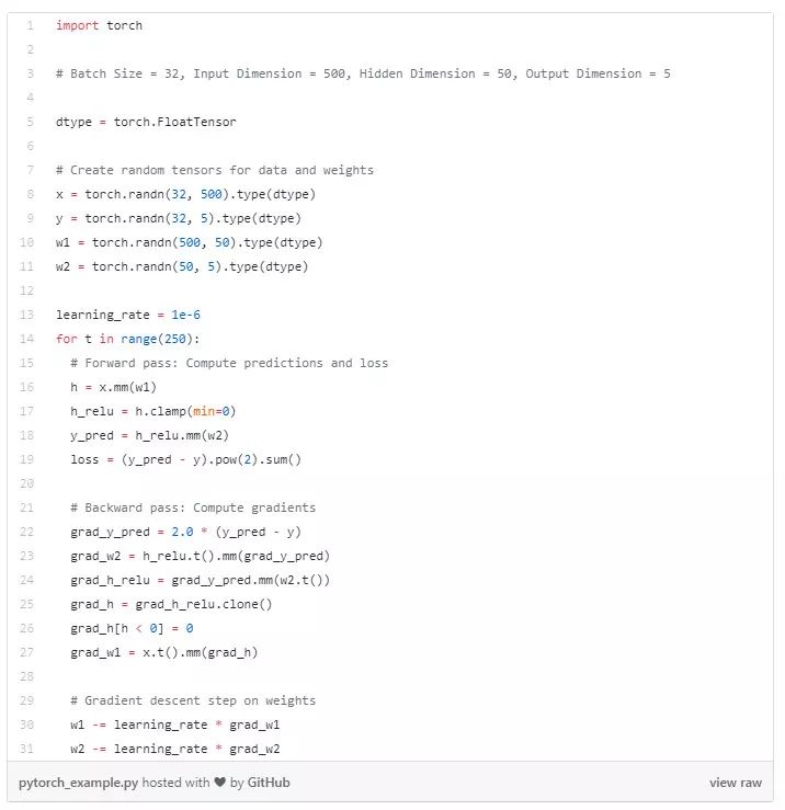 作为PyTorch的直系祖先,Torch与PyTorchg共享了很多C后端。与具有3个抽象级别的PyTorch不同,Torch只有2个:张量和模块。让我们试一试一个使用Torch张量来训练两层神经网络的代码教程: