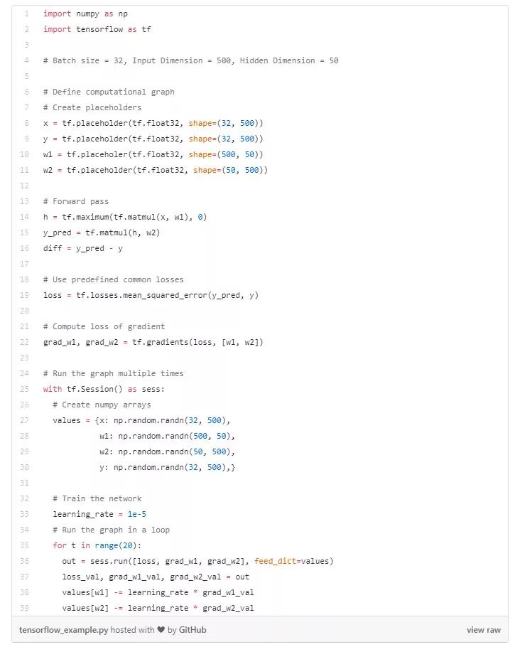 完成计算图构建之后,我创建一个会话框来运行计算图。在这里我创建了numpy数组,它将填充建图时创建的placeholders(占位符),将它们数值提供给x,y,w1,w2。为了训练网络,我反复运行计算图,使用梯度来更新权重然后获得loss,grad_w1和grad_w2的numpy数组。