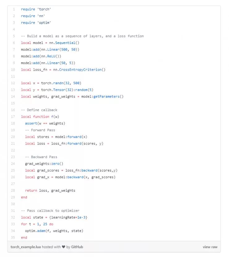 接下来我们来谈谈Torch。它是Facebook的开源机器学习库、科学计算框架和基于Lua编程语言的脚本语言。它提供了广泛的深度学习算法,并已被Facebook,IBM,Yandex和其他公司用于解决数据流的硬件问题。