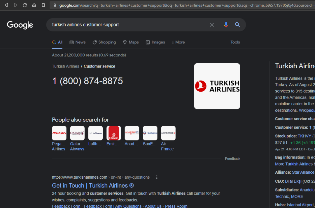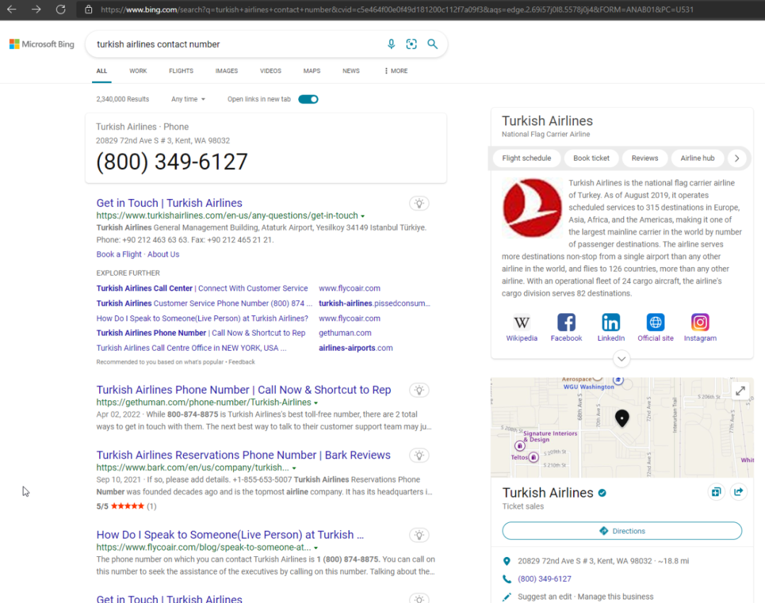 因为 @derekantrican 想就 TA 和 GF 上不同的航班细节进行确认,而众所周知,Edge 浏览器默认使用 Bing 搜索引擎,他便在 Bing 上搜索“土耳其航空公司联系电话”。以下是 @derekantrican 在 Bing 上看到的搜索结果: