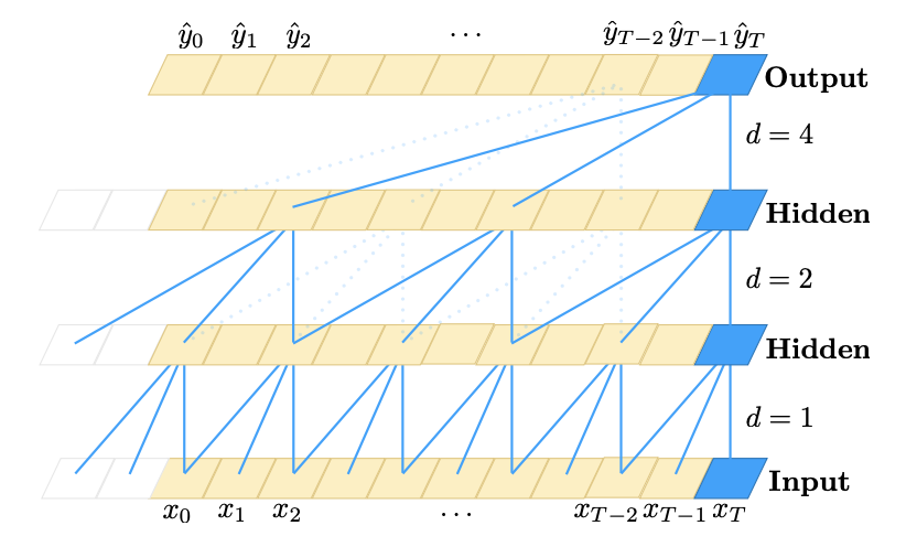 扩张卷积示意图,其中过滤器大小k = 3,扩张因子d = 1, 2, 4。感受野可以覆盖来自输入序列的所有数据点x_0...x_T。图源:https://arxiv.org/pdf/1803.01271.pdf