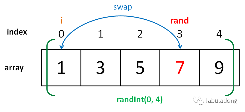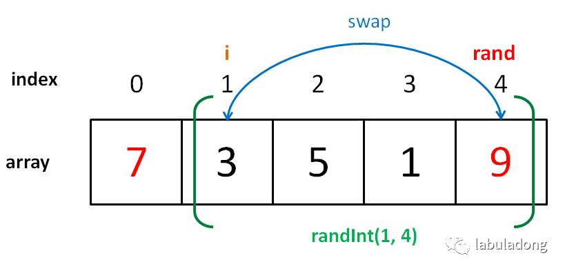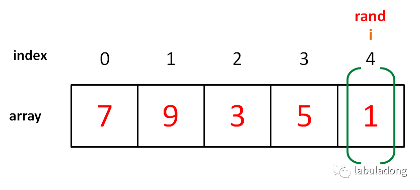 后面以此类推,直到最后一次迭代,i=4,rand 的取值范围是 [4,4],只有 1 个可能的取值。