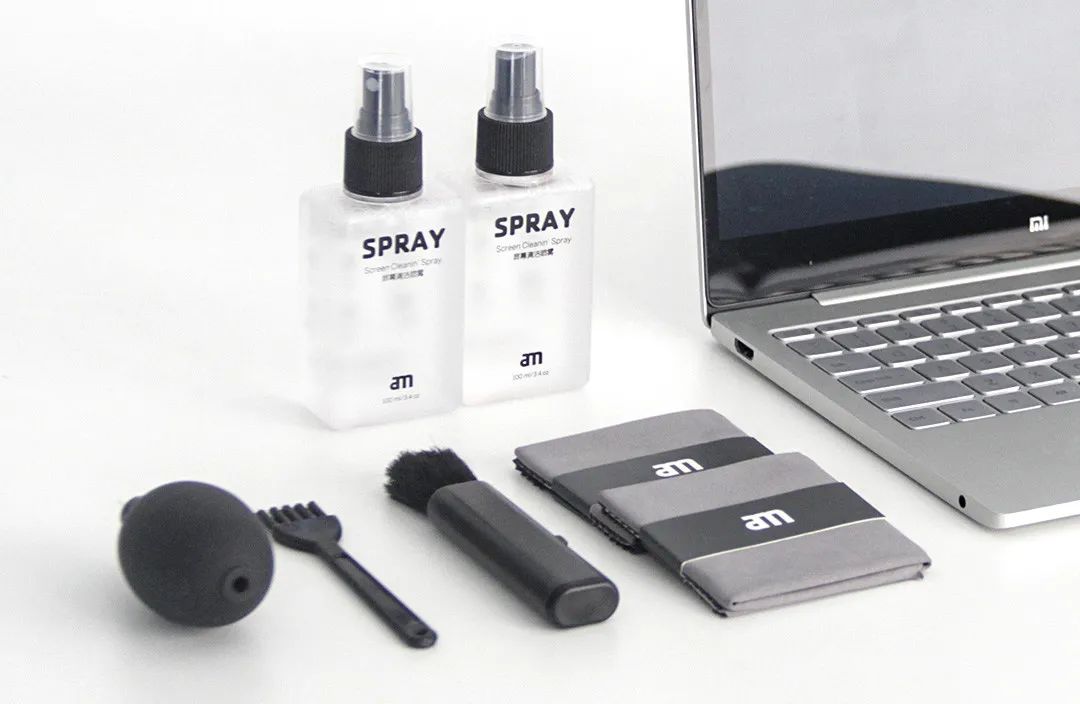 如果你想一步到位地搞定清洁难题,AM 清洁套装是你最好的选择。套装包含屏幕清洁剂、专用擦拭布、两把刷子和一个气吹。屏幕清洁液的成分与另售的二合一喷雾成分一致,但容量更大。两把刷子分别为用于拂去表面灰尘的伸缩硬刷和清理缝隙的塑料硬刷,配合上气吹,让你身边的灰尘无处遁形。