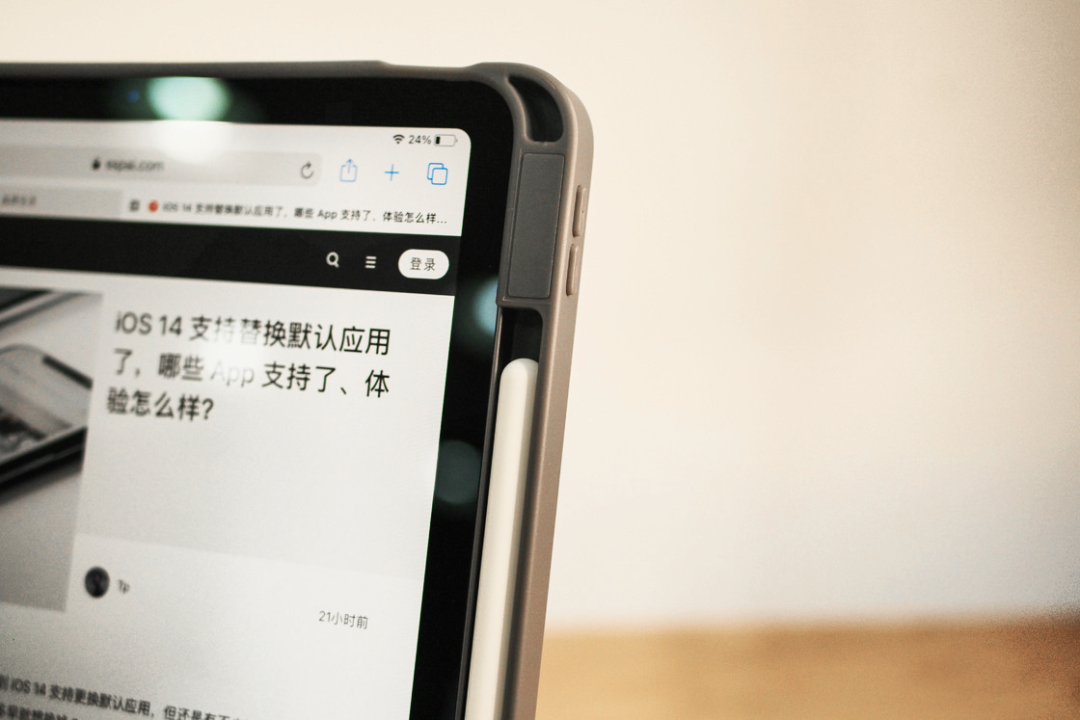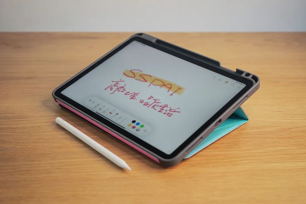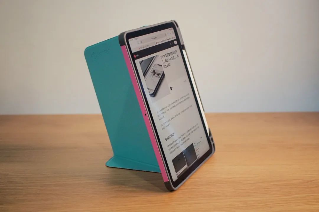 这款保护套还可以作为支架使用,和官方智能双面夹不同的是,tomtoc 保护套提供了更多的支撑角度,包括横屏、竖屏和手写三种模式。横屏模式下和官方智能双面夹类似,但是角度更多,可以在 30°-60° 之内任意调节。竖屏模式是官方保护壳没有的一种模式,更适合浏览文字等内容,手写模式下 tomtoc 保护壳将 iPad Air 稍微抬高一些,使用 Apple Pencil 绘画或标注时更加稳定和顺手。