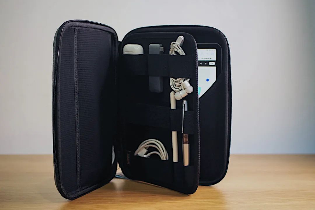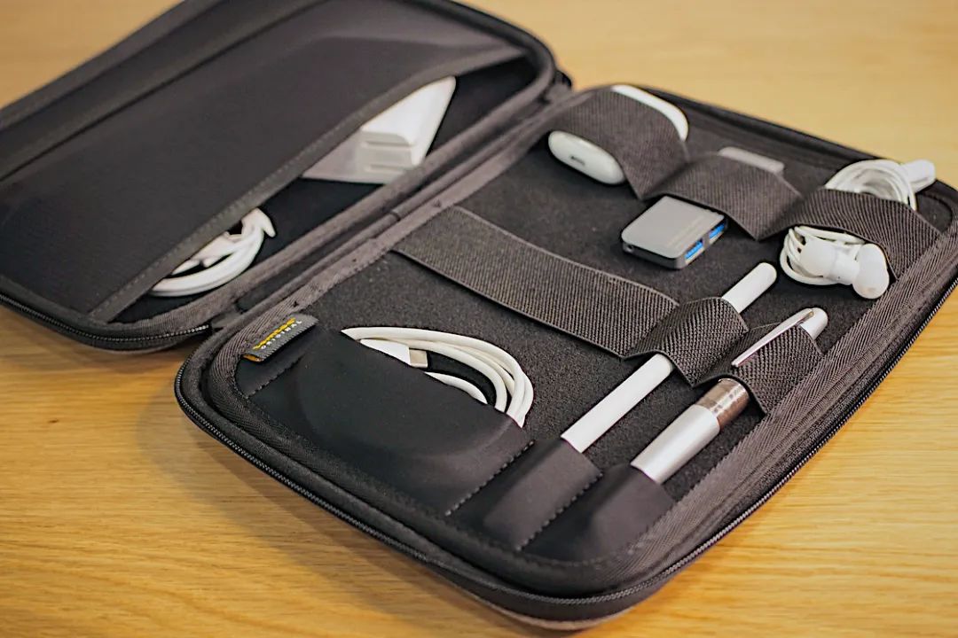 现在大家外出旅行携带数码设备时,还需要带上充电器数据线等各种配件,这些配件如果散落在包内不仅看起来非常凌乱而且也不便寻找。tomtoc 的硬壳收纳包就像是增强型的内胆包,坚硬的 EVA 硬质材料可以承受挤压,内部除了放置 iPad Air 的位置,还提供了收纳数据线、读卡器、充电器甚至移动硬盘的位置,利用松紧绑带可以将这些都配件都井井有条地固定在收纳包内,tomtoc 硬壳收纳包分为标准版和扩容版,扩容版厚度增加了 13mm,可以放入原装充电器、罗技 K380 蓝牙键盘等配件,将所有数码配件都收纳于一处。
