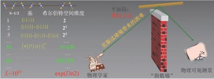 图1 量子多体物理中的“指数墙”困难(参见W. Kohn 1998 年的Nobel Lecture: Electronic structure of matter——wave functions and density functionals)