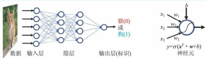下面我们通过一个图像识别的例子,来说明神经网络的工作原理和该方法与传统算法的区别。假设有大量关于猫和狗的不同照片,我们希望编写程序来让计算机对这些图片进行分类。在传统的逻辑编程中,程序员自身必须知道猫和狗照片的本质区别,并将其精确地翻译成计算机语言,对每张输入图片进行“if…,then…”的逻辑判断,输出结果。不幸的是,对这样一类问题,这种传统的编程方法一般很难成功。一方面由于区分“猫和狗照片的本质区别”的精确判据可能很难找到,甚至根本不存在(对每一条判定标准,人们往往都可以找到反例)。另一方面,输入的图片可能有无穷多种可能性,程序员很难穷举出所有可能出现的情况。人工神经网络方法针对这类问题,提供了一种新的解决问题的思路。人们将一部分具有正确标识的图片输入网络,并将网络预言的标识和正确标识做比较,通过动态调节网络参数(神经元间的连接强度和神经元的偏置),不断提高网络预言标识的准确率,最终完成从图片到标识这一函数拟合。在训练过程中,机器自动提取了很多区别猫和狗图像的重要特征,尽管其中单个的特征作为判定标准(例如猫头的形状一般比狗更圆),可能不够精确,但是机器会根据训练结果,自动地将提取出的特征做出综合权衡,并将它们以某种形式储存到网络参数中,最终形成自己的判定标准并以此对标识未知的新图片进行判断,最终我们认为机器通过训练“学会”了区分猫和狗的图片。从这个例子中,我们可以看到机器学习方法的一些特点:(1)该算法适用于处理很复杂甚至定义比较模糊的问题,这些问题往往超越了传统的穷举法和逻辑编程方法的处理能力;(2)在这一算法中,程序员本身不需要知道猫和狗的本质区别在哪里,所有这些区别或判定标准都是机器在训练过程中自动涌现的;(3)它是一种启发性的近似算法,通过牺牲一定的精确性来提高算法的效率,但不能保证预言结果百分之百准确;(4)在多数情况下,没有普适标准来保证该方法的成功率和效率,在很多具体问题中,人工神经网络的设计高度依赖于程序员的经验和直觉。