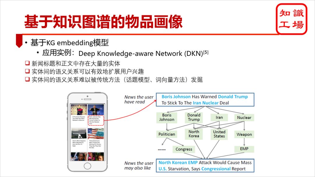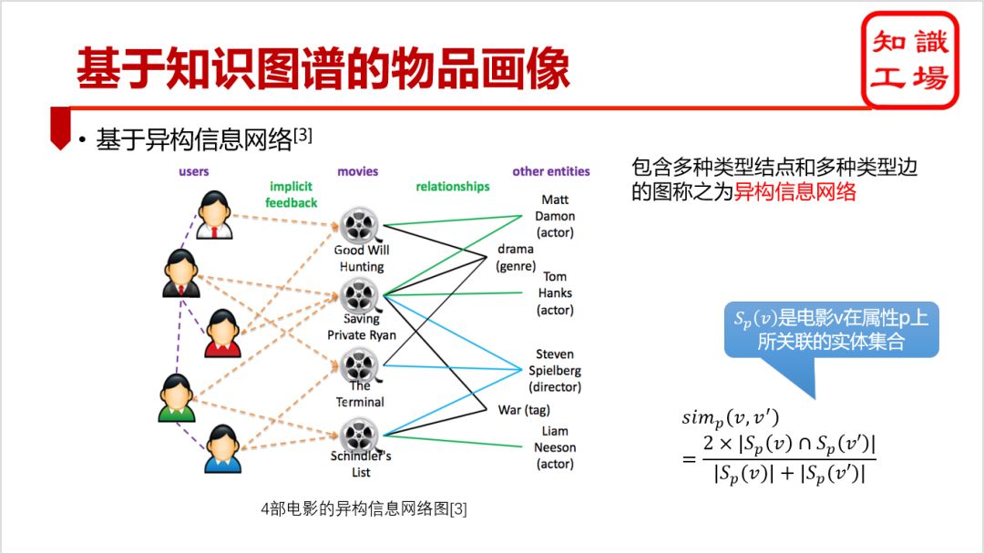 显式画像:从知识图谱中直接找到的关联(例如两部电影的共同属性)作为刻画两个物品相关性的依据。有基于向量空间模式和基于异构信息网络两种模式。