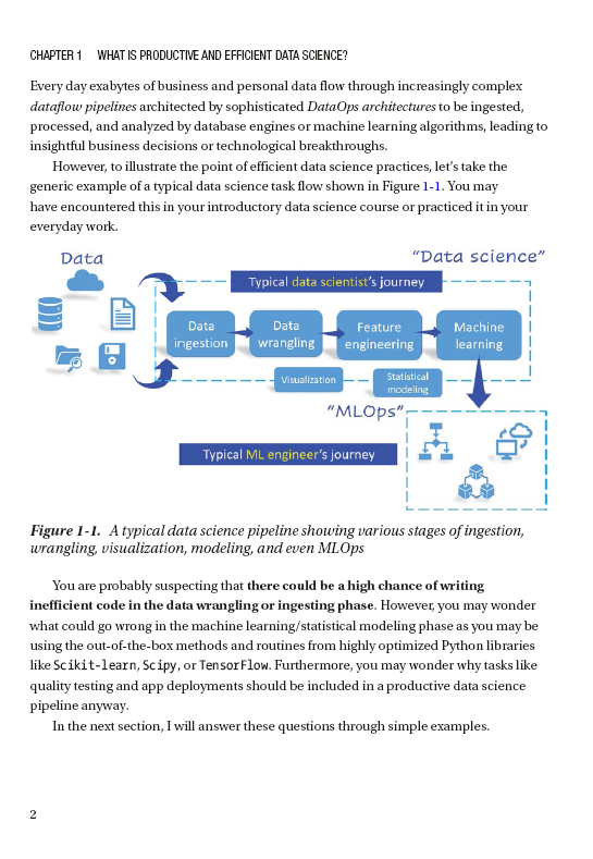 您将回顾日常业务流程中潜伏的低效率和瓶颈,并使用实际的解决方案来解决它们。重复数据科学任务的自动化是贯穿全书的一个关键思维模式。您将学习如何在Python生态系统中已经存在的高级库和包的帮助下扩展现有的编码实践,以高效地处理更大的数据集。