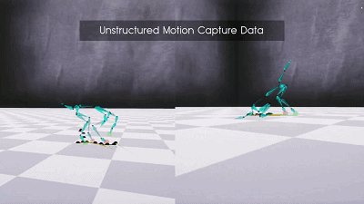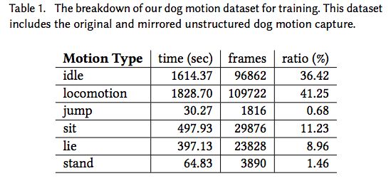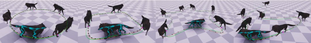研究人员使用狗的动作捕捉(Dog Motion Capture)作为训练数据。这些数据包含各种运动模式,例如步行、踱步、小跑、跑步等,以及其他类型的动作,例如坐、站、闲散,躺着和跳跃。通过镜像将数据规模加倍。
