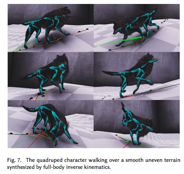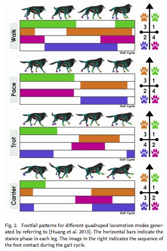 四足动物运动的多模态造成了动画制作的复杂性。四足动物有多种移动模式,例如步行、踱步、快走、慢跑、疾跑等,运动时其躯干和四肢的相位变化非常复杂。