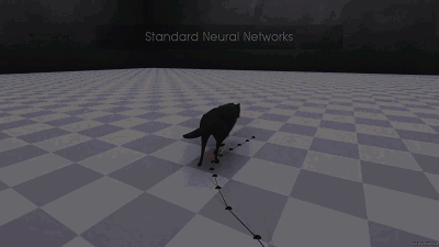上图的动画由相位函数神经网络(Phase-Functioned Neural Networks)的方式生成,优点是动作精准,但是当两个动作进行融合时动作显得僵硬,而且操控不是那么灵敏。