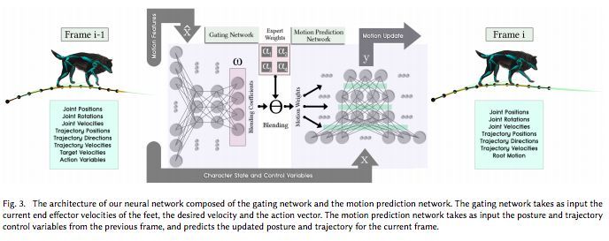这个系统由运动预测网络和门控网络组成。在每一帧处,运动预测网络在给定的前一帧的状态和用户提供控制信号的情况下计算当前帧的角色状态。门控网络通过选择和混合所谓的专家权重(expert weights),动态地更新运动预测网络的权重,每个expert weight都专门针对特定的运动。