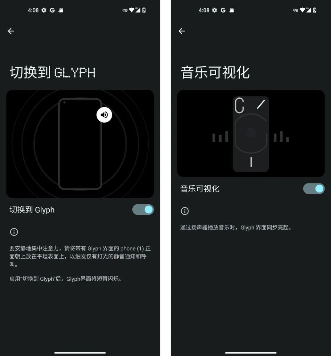 这套 LED 模组叫做 Glyphs,是象形文字的意思。在手机中打开 Glyphs 的功能之后,每当我们倒扣手机,这套 LED 灯就会闪烁几下,告诉我们它已经开始工作了。除了常见的通知提醒,Glyphs 还支持音乐可视化(隐藏功能)、显示充电进度、视频拍摄补光。