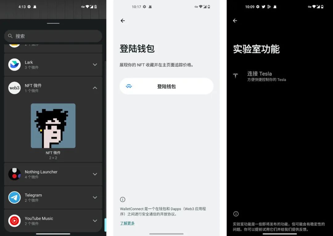 功能层面,Nothing Phone (1) 则加入了一些小细节,比如支持展示 NFT 的小部件和内置数字钱包,实验功能中支持系统级的特斯拉联动(国内貌似暂时无法使用)。这些功能基本都是踩着行业「热点」来实现的,对国内大众用户来说却可以说是可有可无。