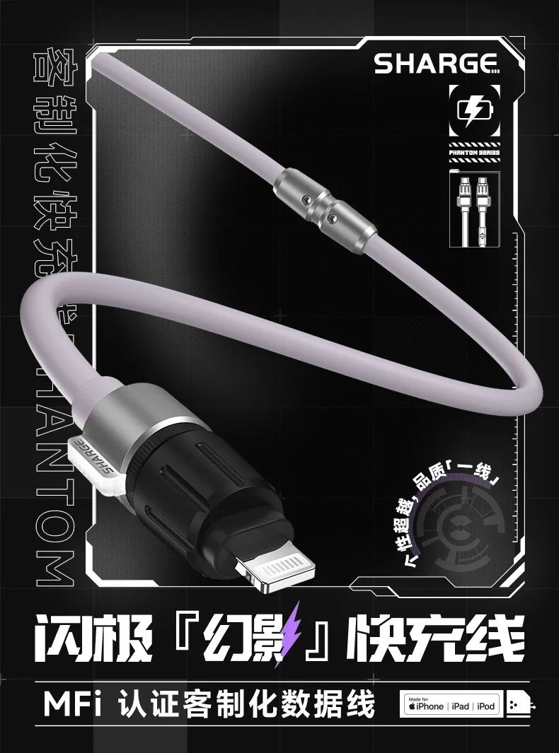 有了充电头自然也要搭配充电线,线材作为一个功能性为主的产品,近些年也有了注重设计和个性化表达的产品。来自闪极幻影数据线使用了类似航插线的外观设计,线材硅胶包裹,搭配一体成型铝合金接口。其中 C to C 版本配备 E-Marker 芯片,最高支持 100W 充电,C to L 版本也经过了 MFi 认证,使用 C94 芯片。