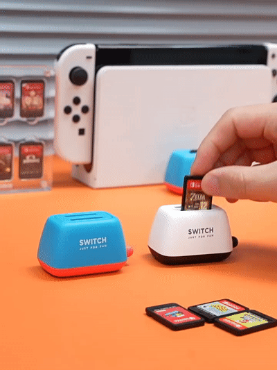 各种 Switch 卡收纳盒产品有不少,而海备思这款仅有两个槽位,数量可以说完全不占优势,它真的有趣的点是类似面包机的造型,插上游戏卡后一按就能弹出,乐趣十足,底部硅胶和配重平稳不易倒,造型圆润可爱,两种配色可选。