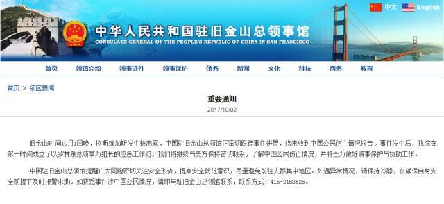 10月2日中国驻旧金山总领馆发布消息称,正密切跟踪事件进展,迄未收到中国公民伤亡情况报告。