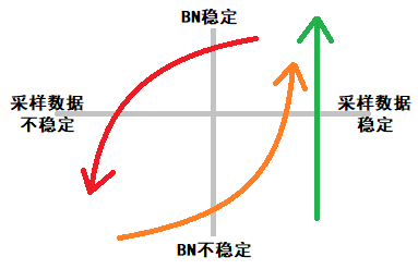 在训练数据稳定时,BN也会趋于稳定,并算出稳定的均值和方差(绿色箭头终点)