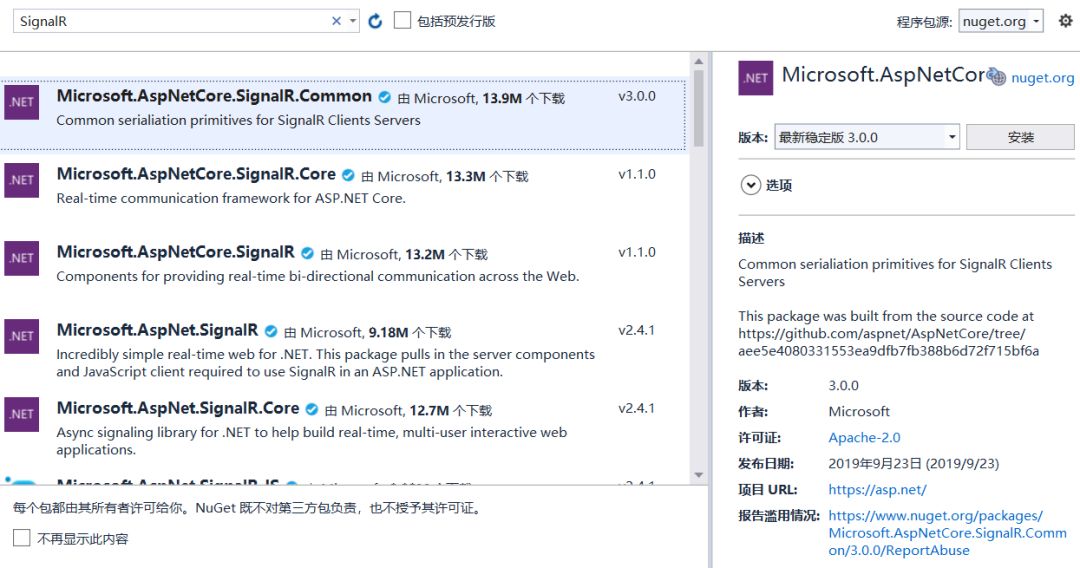 但是只有Common是有3.0版本的,后来发现我需要的是Microsoft.AspNetCore.SignalR.Core,然而这个停更的状态?