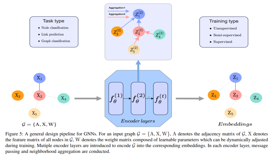 图是一种常用的数据结构,用于描述社交网络、推荐系统等复杂系统。在过去的几年中,由于图的强大表达能力,图表示学习[163]逐渐引起了机器学习界的关注,它旨在建立能够从非欧几里得数据中高效学习的模型。与此同时,各种图神经网络[164]应运而生,它们在结构化数据挖掘任务中显示出巨大的潜力,如节点分类、链接预测或图分类等。然而,当这些图数据挖掘任务遇到许多无监督/有监督的场景,其中很少,甚至没有有效的数据或标签存在,如何提高这些任务在图上的性能,并在这些情况下获得一个鲁棒的模型?同时,图神经网络的关系结构发现[165]、[166]、[167]、表征能力[168]等有意义的子主题也有待探索,从数据表示的角度来看,可能也需要有效的思路。针对上述问题,对小数据的学习可以提供必要和强大的支持,由于其可观的数据发现效率和较强的表示能力,可以促进图表示学习的发展。特别地,图5给出了GNN的一般设计流程。在该设计流程的方案下,GNN可分为递归图神经网络、卷积图神经网络、图自编码器和时空图神经网络。分类的详细描述如下[164]。