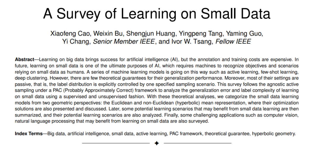 对小数据的学习对于推进人工智能至关重要。少样本学习作为一个先行课题,对有限数据训练进行了探索。而少样本学习的设置是一个被动的场景,任务本身规定的标签信息不足。同时,它的泛化性能几乎没有理论保证。这促使我们对小数据的学习进行理论分析。利用主动抽样理论,我们遵循PAC框架提出了一组用于小数据学习的误差和标签复杂性边界。为了总结这些算法范式,我们然后将小数据学习模型分为:欧几里得和双曲(非欧几里得)表示,包括它们的深度学习场景。具体地说,这项综述的贡献总结如下。