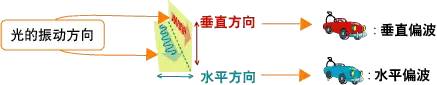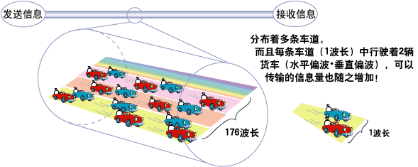 光在振动的同时向前进。振动的方向叫做“偏波”,分成垂直振动前进的光(垂直偏波)和水平振动前进的光(水平偏波)两种。偏波中包含的信息不会互相干扰,可传输大量信息。比如说,1条车道上同时行驶着2辆货车,这2辆货车在传输信息时不会发生碰撞。