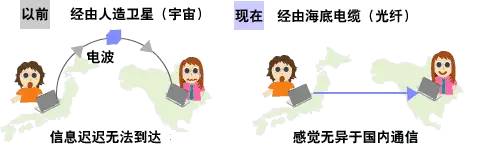 比如说,现在和国外的朋友通话或上网聊天时,感觉与在国内通话没什么两样。不像以前那样声音会滞后。在只有电通信的时代,一次能传输的距离短而且传输的信息量少,国际间的通信主要通过人造卫星作为中继传输。但是,使用光通信的话,一次性传输的距离长而且传输的信息量多,因此,通过使用铺设在海底的光纤光缆,就能实现与海外自然畅通的通信。(电波和光的速度相同。但是,由于经由卫星的话传输路径会变长,信号到达较慢。海底电缆的距离短很多,所以信号会更快达到。)