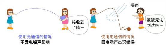 电通信会因电噪声出现错误,导致通信速度下降。但是,光通信不会受到噪声的影响,因此可快速传输信号。