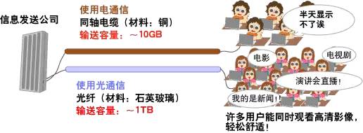 大量用户可以同时接收需要的信息(电影或新闻等)。在1秒钟内,电通信最多只能传输10Gb(100亿个0和1信号)的信息,与此相比,光通信最多可以传输1Tb(1万亿个0和1信号)的信息。