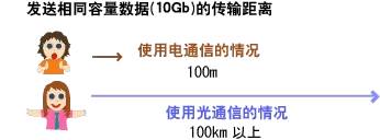 假设1秒钟内要传输10Gb的信息(100亿个信号),如果使用电通信的话,每隔100米就要调整一次信号。与此相比,使用光通信的话,需要调整间隔可为100千米以上。调整信号的次数越少,所使用的机器数量也越少,因此具有经济节能的效果。