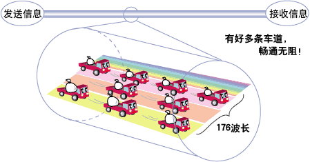 一次能传输的信息量较多,通过改变波长,可同时传输多位用户的信息。比如说,即使多位用户同时发送信息,只要分布着多条车道就不易造成堵塞,能够流畅地运送货物(比特数),而且传输速度比较平稳。