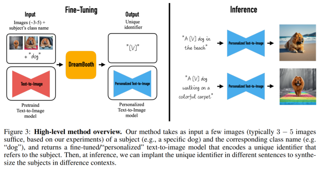 本文方法将一个主题(例如,一只特定的狗)和相应类名(例如,狗类别)的一些图像(通常 3 - 5 张图)作为输入,并返回一个经过微调 / 个性化的文本到图像模型,该模型编码了一个引用主题的唯一标识符。然后,在推理时,可以在不同的句子中植入唯一标识符来合成不同语境中的主题。