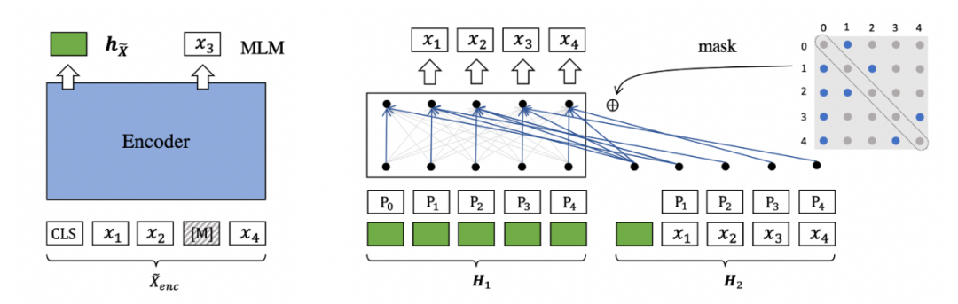 解码增强。双流注意力机制(H1:query stream,H2:content stream),随机生成注意力掩码矩阵(蓝色点:可见位置,灰色点:掩码位置)