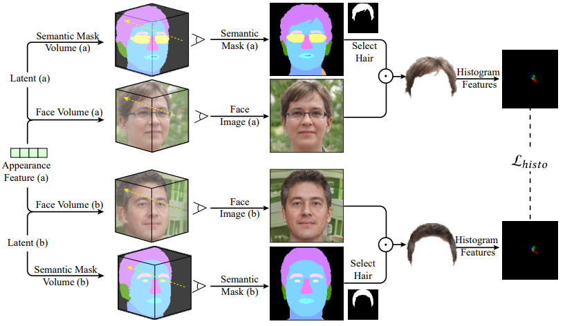 NeRFFaceEditing 将二维的语义掩码作为三维几何编辑的桥梁,用户在一个视角下进行的语义编辑可以传播到整个三维人脸的几何,并保持材质不变。进一步,给定表示参考风格的图像,用户可以轻松的更改整个三维人脸的材质风格,并保持几何不变。