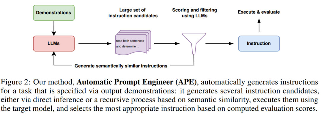直观地说,本文提出的算法要求 LLM 根据演示生成一组指令候选,然后要求算法评估哪些指令更有希望,并将该算法命名为 APE(Automatic Prompt Engineer)。