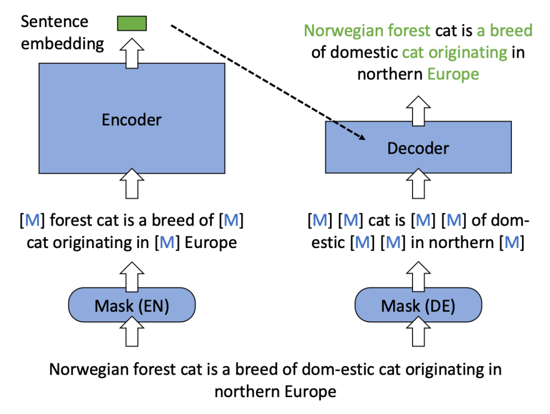 基础架构:掩码自编码器。RetroMAE 采用了经典的掩码自编码器这一架构来预训练模型的语义表征能力。首先,输入文本经掩码操作后由编码器(Encoder)映射为隐空间中的语义向量;而后,解码器(Decoder)借助语义向量将另一段独立掩码的输入文本还原为原始的输入文本。
