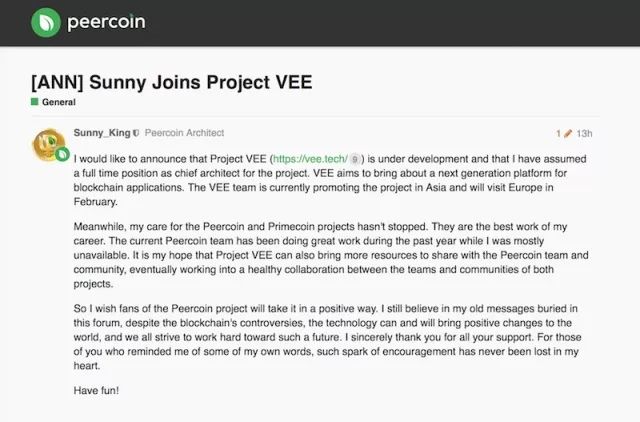 Sunny King还说,他仍然在持续关注点点币(Peer Coin)和质数币(Prime Coin),在过去的一年里,点点币团队一直在努力工作。“我希望 VEE 项目也能带来更多资源与点点币团队和社区共享,最终两个项目的团队和社区会保持健康的合作关系。”他写到。