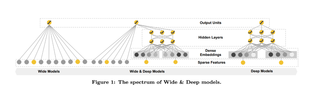 这个是原论文中的架构图,我们自己在实践的时候不一定完全遵守。比如架构图中Wide部分只是使用了交叉特征,我们在使用的时候可以把原始的离散特征或者打散后的连续特征加过来。