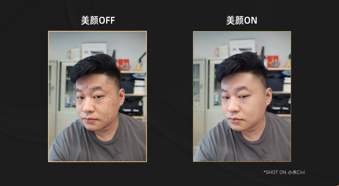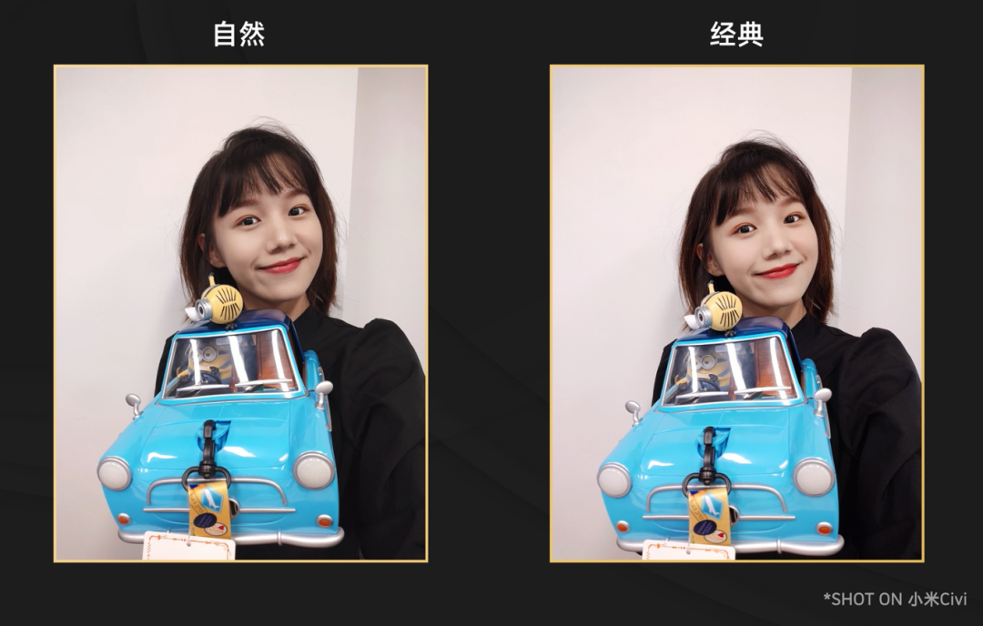 在默认的自拍界面里,小米 Civi 提供了自然和经典两种自拍模式,自然模式突出面部结构和五官轮廓,保留更多的皮肤原始特征和纹理,经典模式呢就是带了简单的「气色妆容」,两种模式各有千秋,按需选择即可。