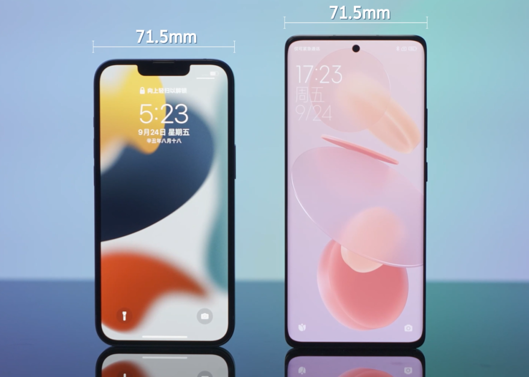 71.5mm 的机身宽度和 iPhone 13 看齐,整机更修长纤细,握持更舒适,下巴做到了小米有史以来最窄的 2.55mm。