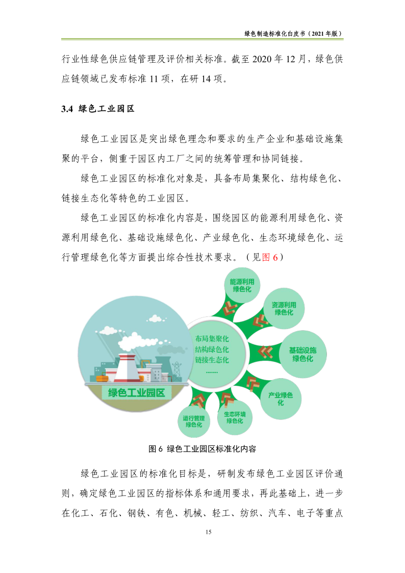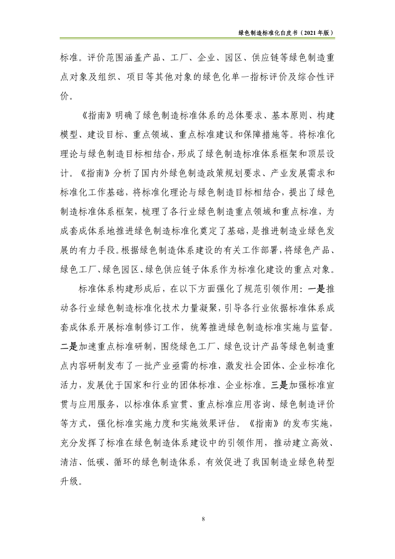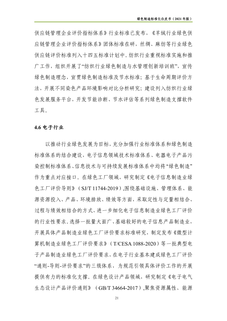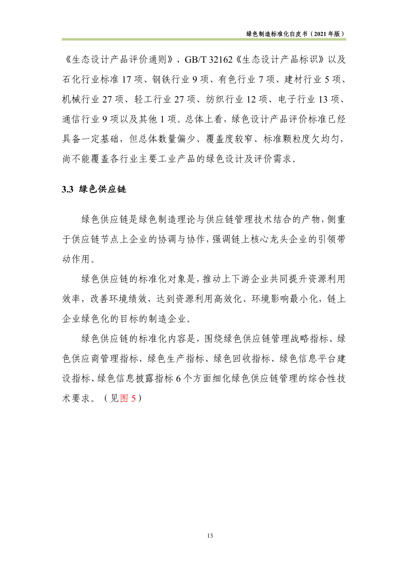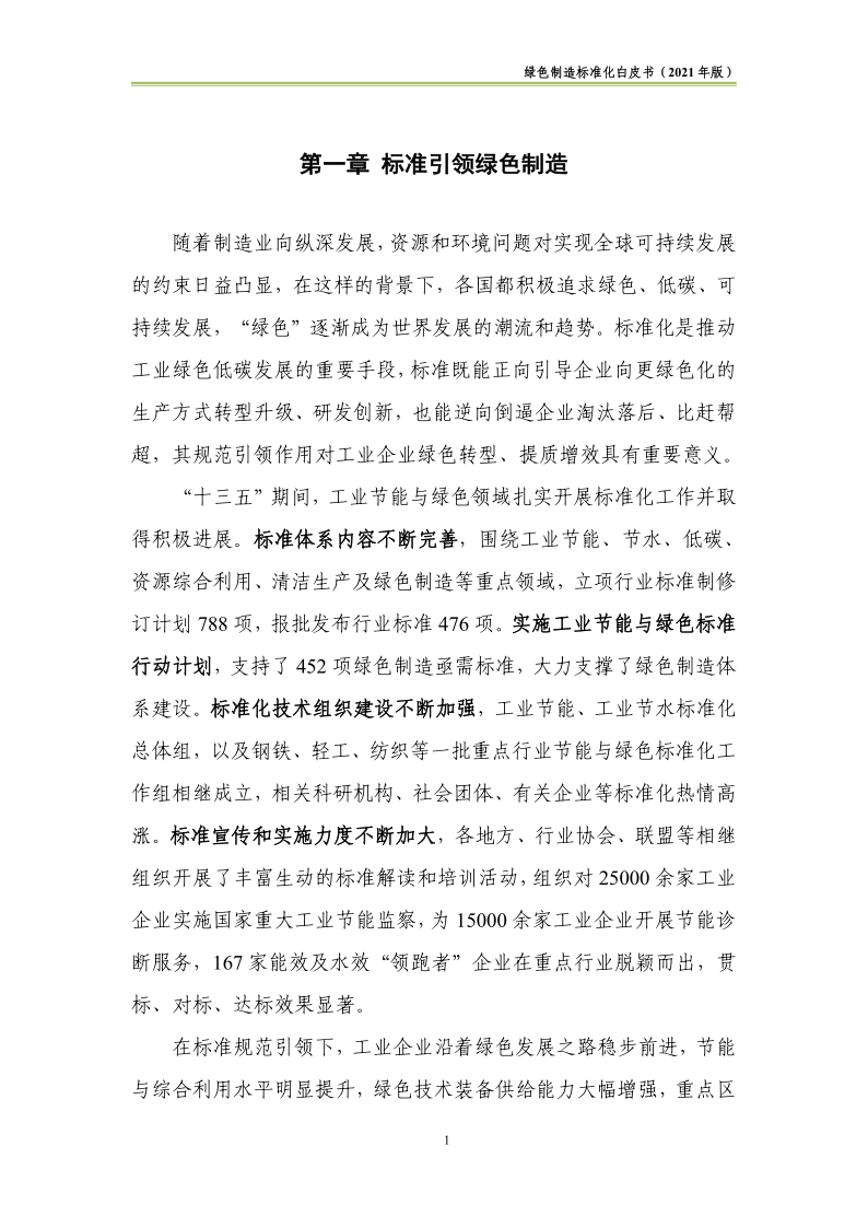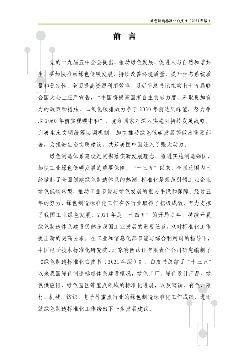 绿色制造体系建设是贯彻落实新发展理念,推进实施制造强国, 加快工业绿色低碳发展的重要保障。“十三五”以来,全国范围内已 经掀起了全面创建绿色制造体系的热潮。标准化是规范引领工业企业 绿色低碳转型,推动工业节能与绿色发展的重要手段和保障。经过五 年的努力,绿色制造标准化工作在各行业取得了积极成效,有力支撑 了我国工业绿色发展。2021 年是“十四五”的开局之年,持续开展 绿色制造体系建设仍然是我国工业发展的重要任务,也对标准化工作 提出新的更高要求。在工业和信息化部节能与综合利用司的指导下, 中国电子技术标准化研究院、北京赛西认证有限责任公司研究编制了 《绿色制造标准化白皮书(2021 年版)》。白皮书总结了“十三五” 以来我国绿色制造标准体系建设概况,绿色工厂、绿色设计产品、绿 色供应链、绿色园区等重点领域的标准化进展,以及钢铁、有色、建 材、机械、纺织、电子等重点行业的绿色制造标准化工作成绩,进而 就绿色制造标准化工作给出下一步发展建议。
