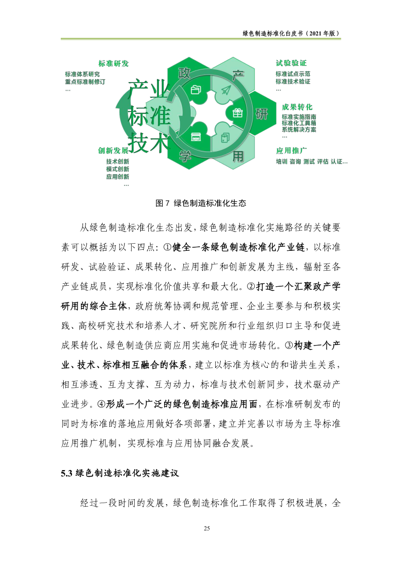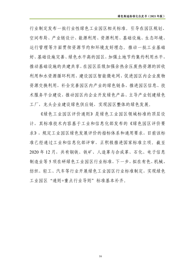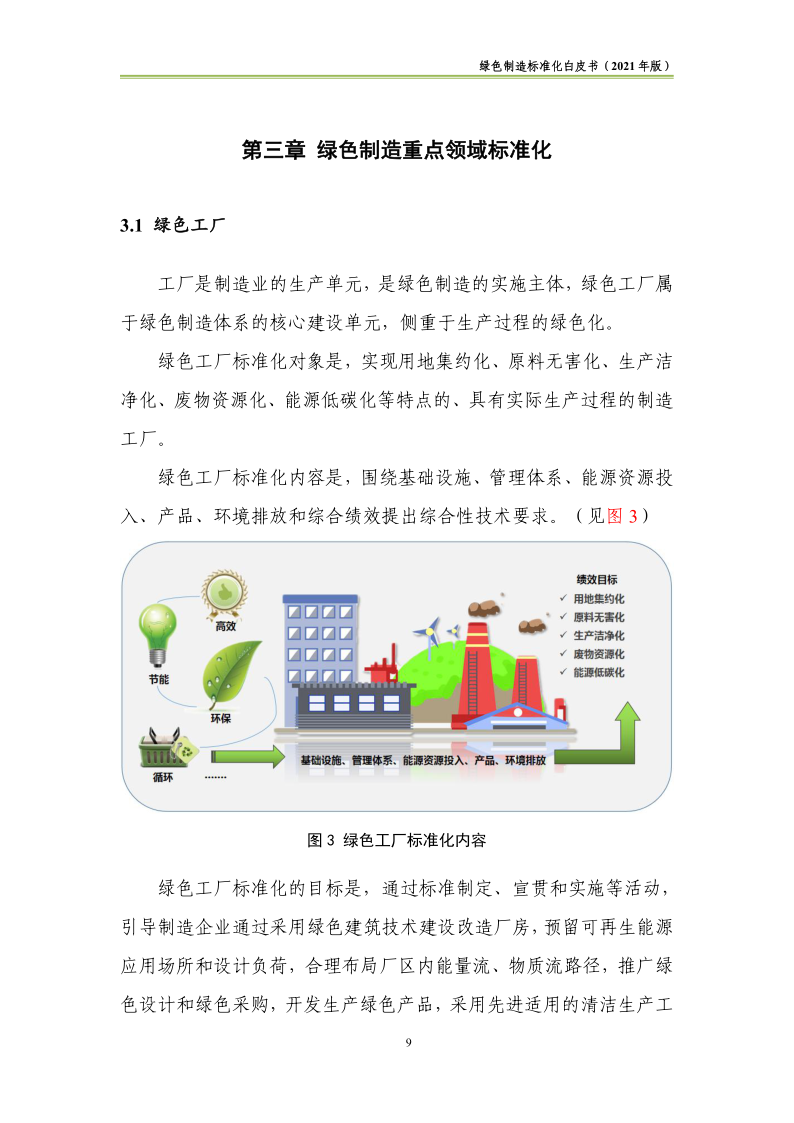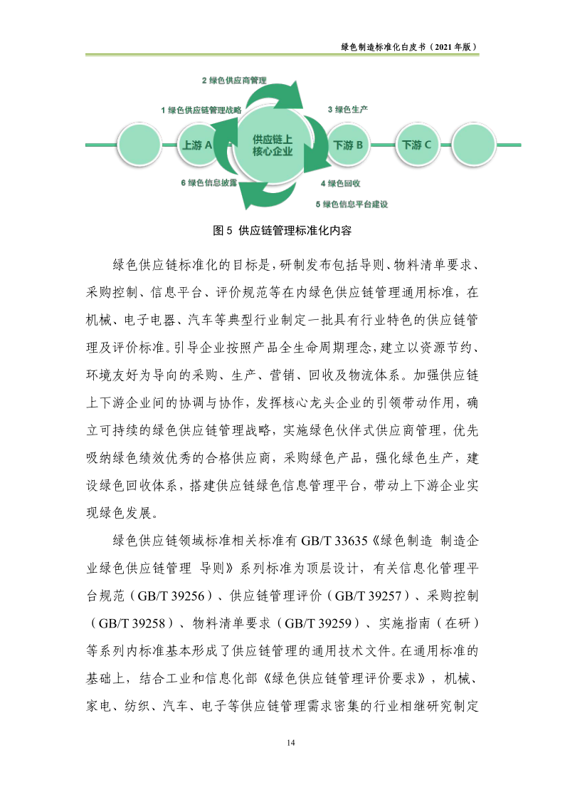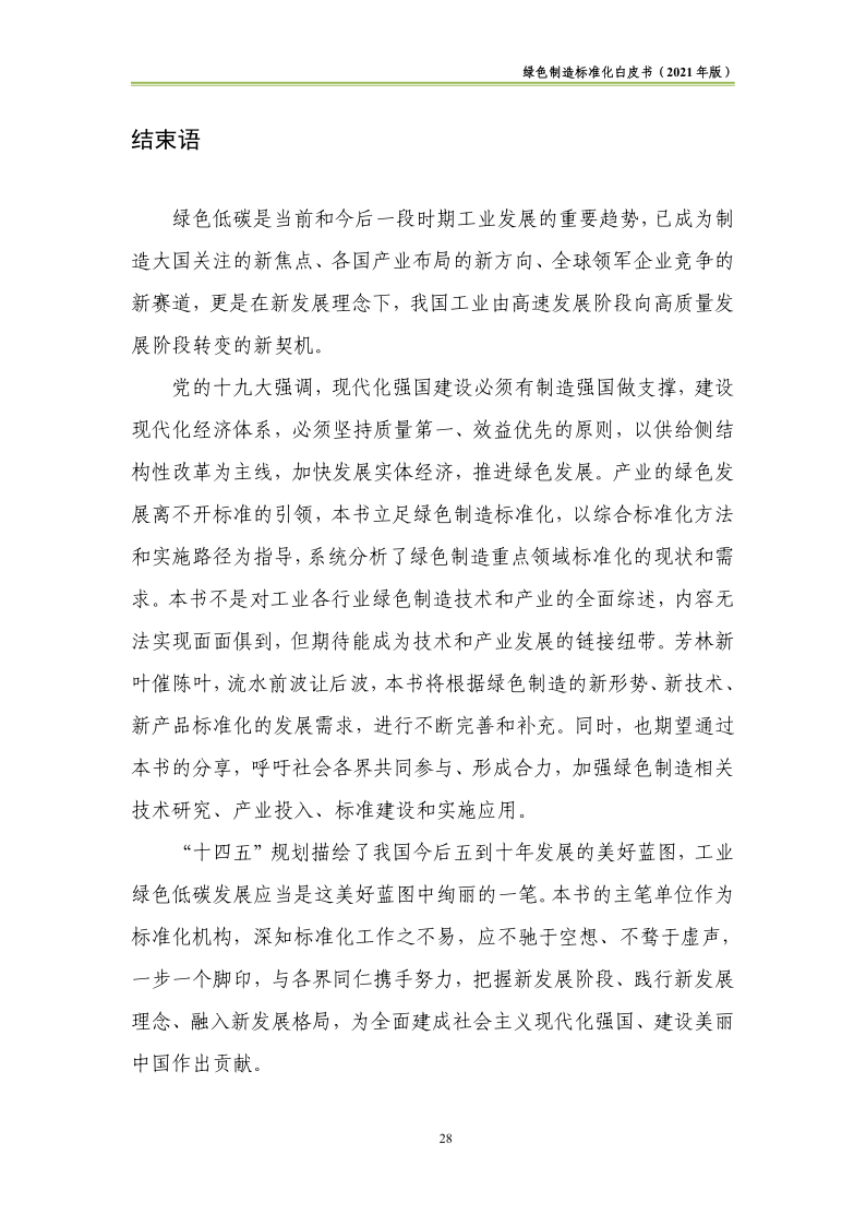 绿色制造体系建设是贯彻落实新发展理念,推进实施制造强国, 加快工业绿色低碳发展的重要保障。“十三五”以来,全国范围内已 经掀起了全面创建绿色制造体系的热潮。标准化是规范引领工业企业 绿色低碳转型,推动工业节能与绿色发展的重要手段和保障。经过五 年的努力,绿色制造标准化工作在各行业取得了积极成效,有力支撑 了我国工业绿色发展。2021 年是“十四五”的开局之年,持续开展 绿色制造体系建设仍然是我国工业发展的重要任务,也对标准化工作 提出新的更高要求。在工业和信息化部节能与综合利用司的指导下, 中国电子技术标准化研究院、北京赛西认证有限责任公司研究编制了 《绿色制造标准化白皮书(2021 年版)》。白皮书总结了“十三五” 以来我国绿色制造标准体系建设概况,绿色工厂、绿色设计产品、绿 色供应链、绿色园区等重点领域的标准化进展,以及钢铁、有色、建 材、机械、纺织、电子等重点行业的绿色制造标准化工作成绩,进而 就绿色制造标准化工作给出下一步发展建议。