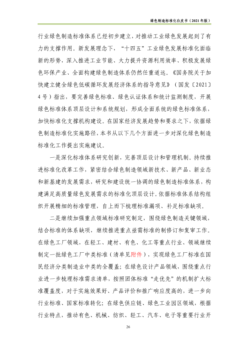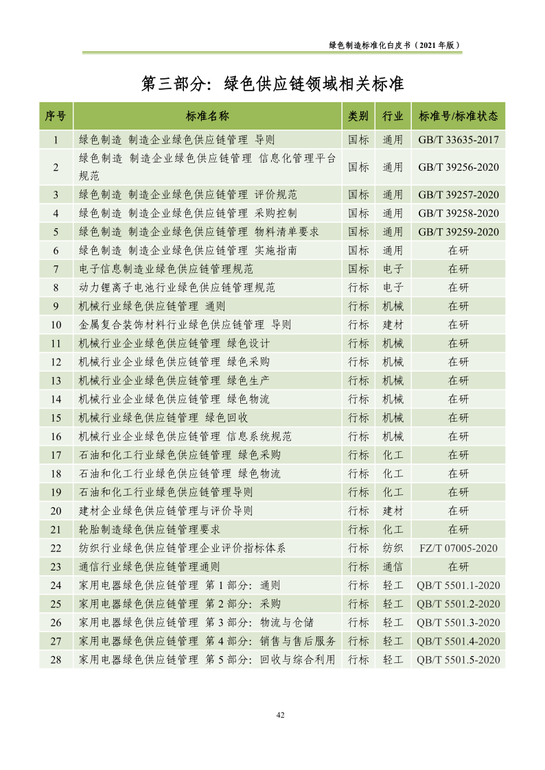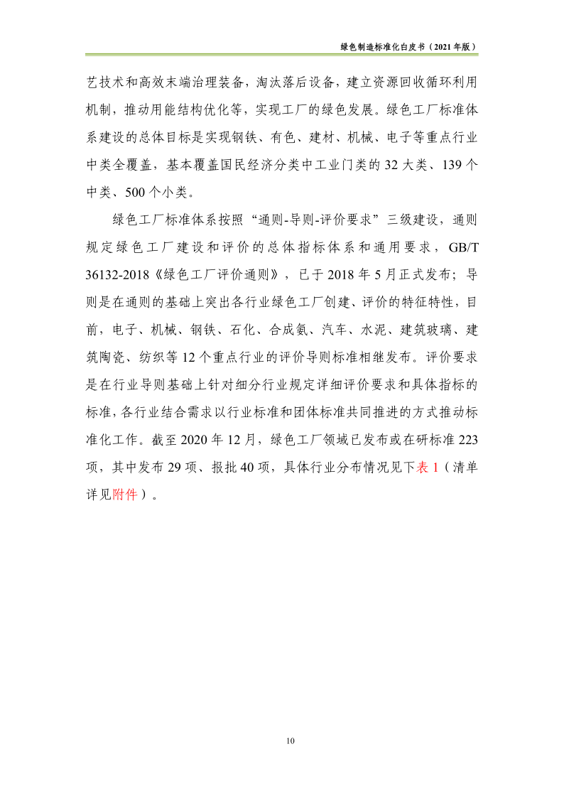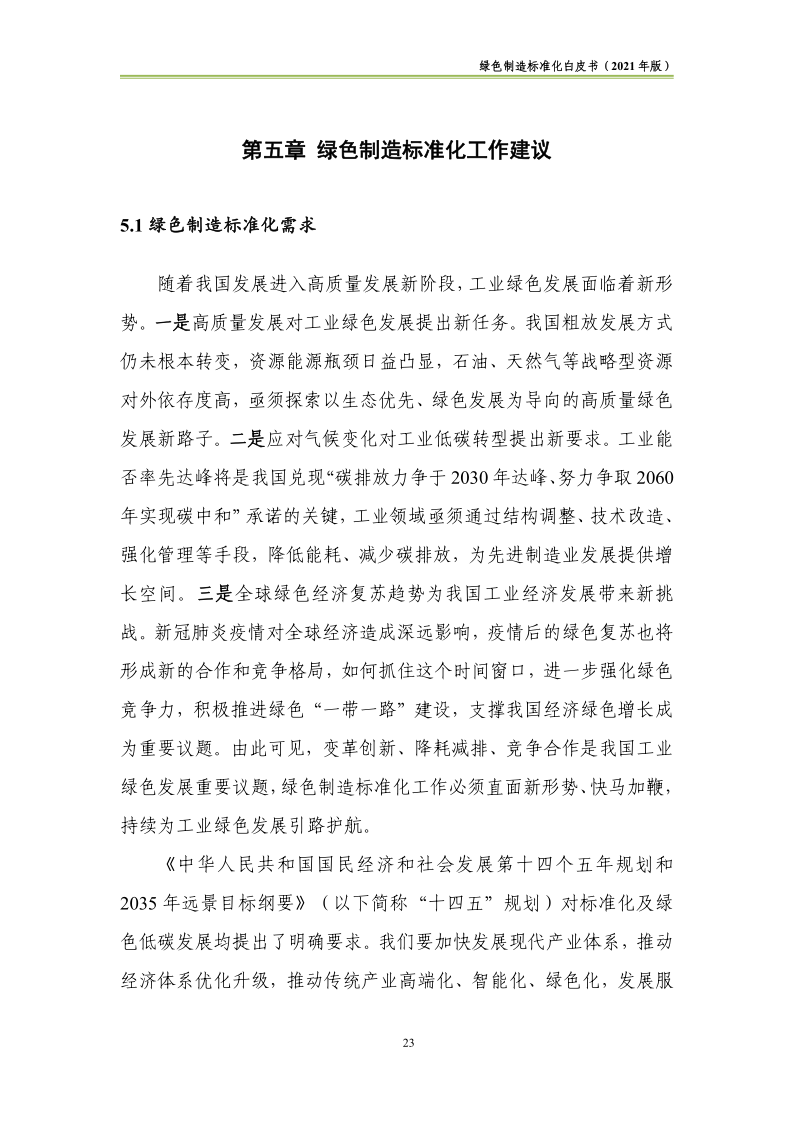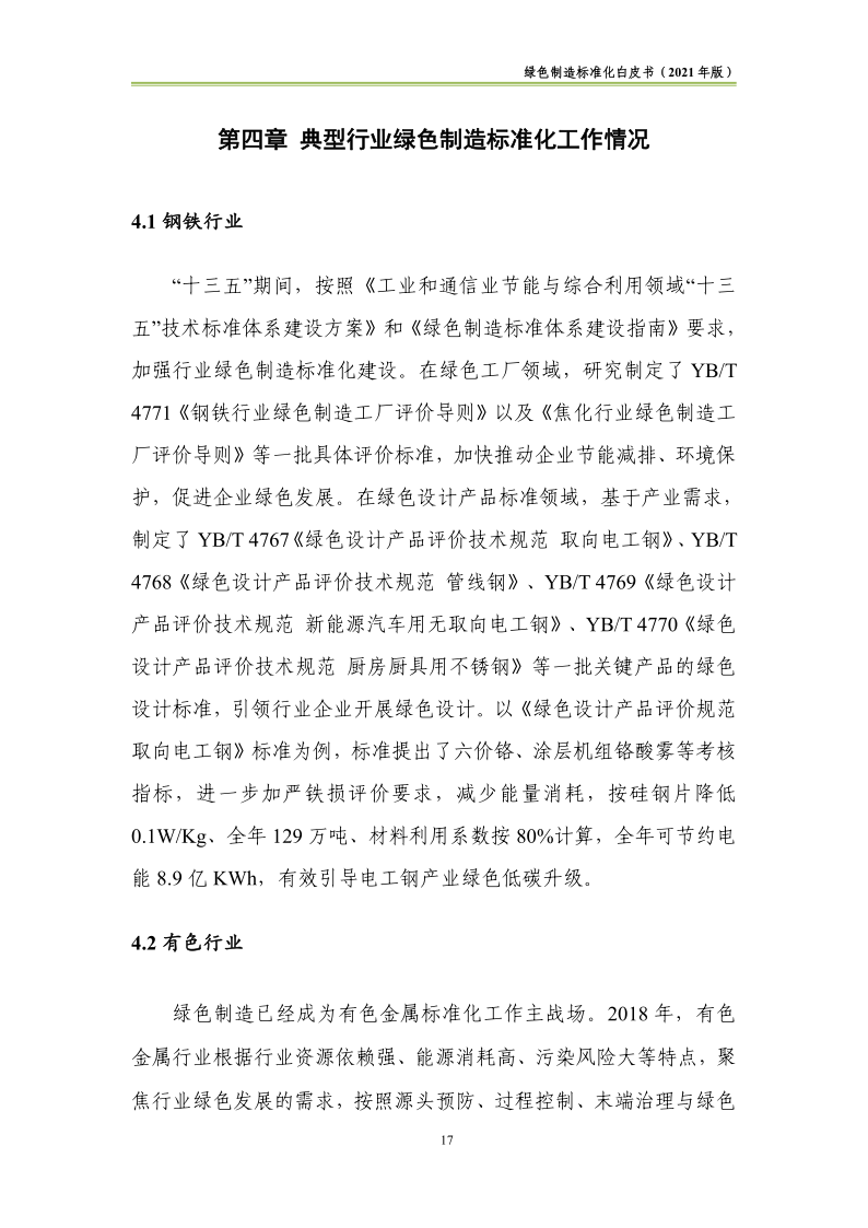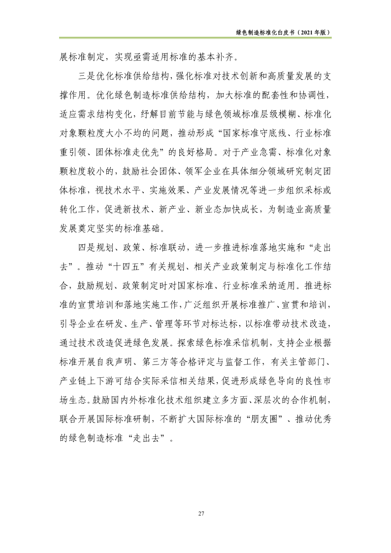 绿色制造体系建设是贯彻落实新发展理念,推进实施制造强国, 加快工业绿色低碳发展的重要保障。“十三五”以来,全国范围内已 经掀起了全面创建绿色制造体系的热潮。标准化是规范引领工业企业 绿色低碳转型,推动工业节能与绿色发展的重要手段和保障。经过五 年的努力,绿色制造标准化工作在各行业取得了积极成效,有力支撑 了我国工业绿色发展。2021 年是“十四五”的开局之年,持续开展 绿色制造体系建设仍然是我国工业发展的重要任务,也对标准化工作 提出新的更高要求。在工业和信息化部节能与综合利用司的指导下, 中国电子技术标准化研究院、北京赛西认证有限责任公司研究编制了 《绿色制造标准化白皮书(2021 年版)》。白皮书总结了“十三五” 以来我国绿色制造标准体系建设概况,绿色工厂、绿色设计产品、绿 色供应链、绿色园区等重点领域的标准化进展,以及钢铁、有色、建 材、机械、纺织、电子等重点行业的绿色制造标准化工作成绩,进而 就绿色制造标准化工作给出下一步发展建议。