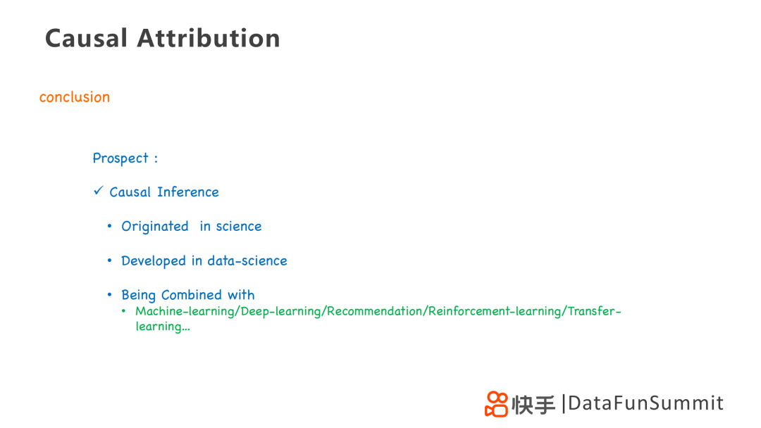 最后总结一下因果分析,它源于一些传统科学例如社会科学、生物学等,如今在数据科学领域也有了很深的发展,也在公司广泛应用。它和机器学习、深度学习、推荐算法、强化学习和迁移学习是融合在一起的,其本质还是寻找有效的样本,解决更本质的问题。